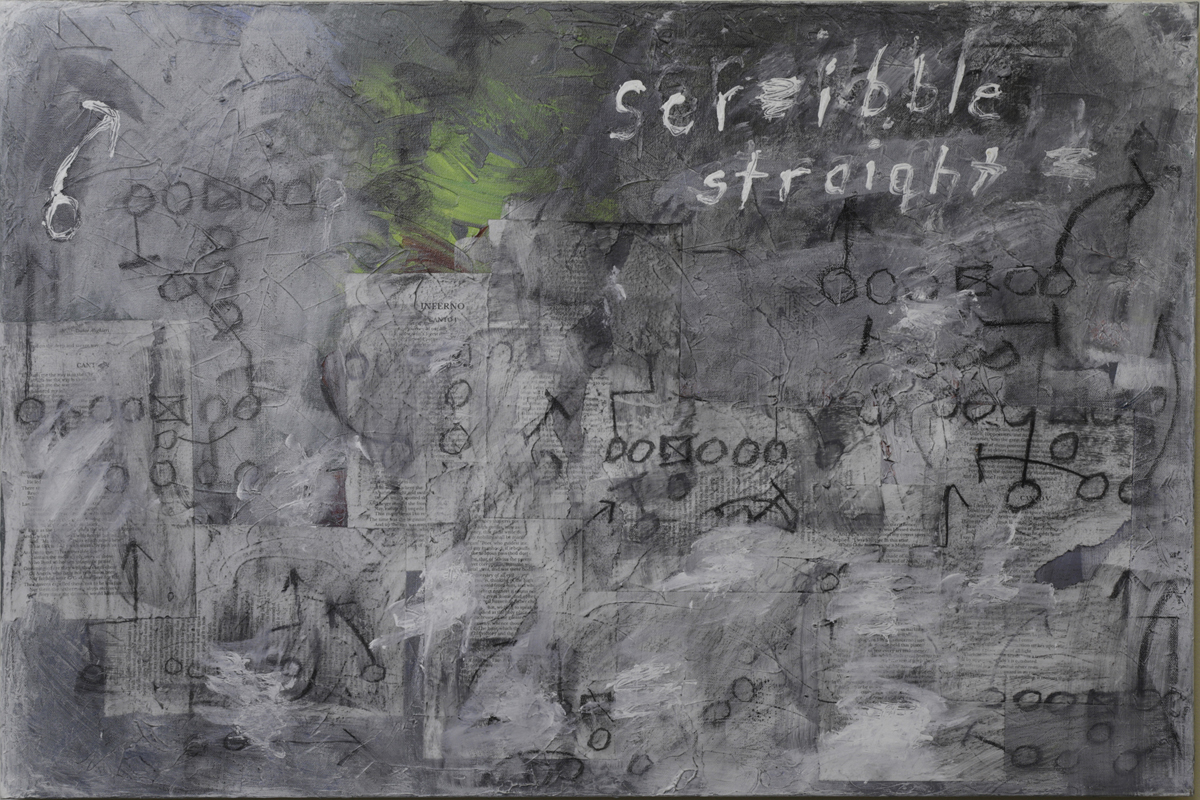 “Scribble Straight” is a special painting to me, not one that I planned. In fact, it started as an experiment. I ripped pages from Dante’s Inferno and pasted them over an older painting. My husband drew up Penn State football plays and I scribbled them in charcoal over the torn story. I imagine Paterno’s constant scribbling surrounded by a mound of worn down #2 pencils and heaps of crumbled notes. I remember the success of “straight down the middle,” regardless of the promise of slant patterns, and Emily Dickinson, “Tell all the truth but tell it slant –”